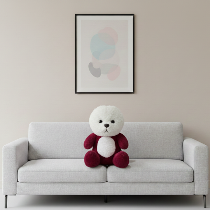 Introducing the Maroon & White Teddy Plush, a charming soft toy designed to bring warmth and comfort to any room. This adorable teddy features a fluffy white head with gentle stitched features and a deep maroon body that adds a rich, cozy contrast. Its round shape and plush filling make it perfect for cuddling, decorating, or gifting.